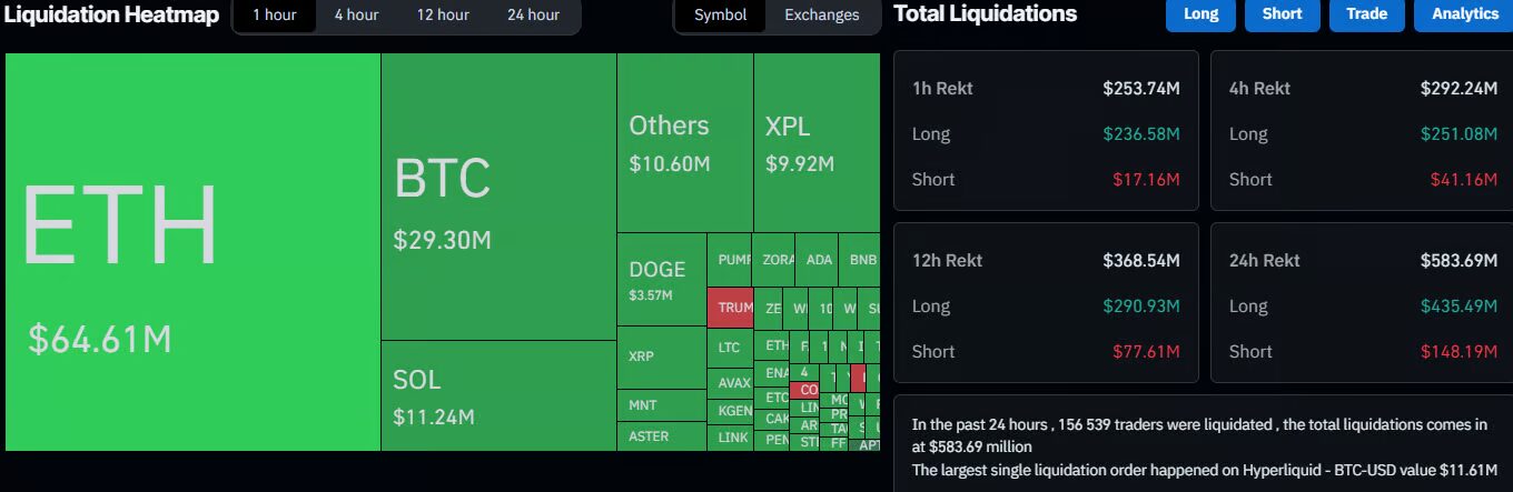 A zuhanás a legtöbb altcoint is magával rántotta: a ZEC, MNT, TAO, M, PUMP, LTC, BONK és PENGU árfolyama egyaránt több mint 4%-kal esett egyetlen órán belül. A tőkeáttételes pozíciók tömegesen likvidálódtak, mindössze 60 perc alatt mintegy 250 millió dollárnyi veszteség keletkezett, míg napos szinten a felszámolt pozíciók értéke már elérte a 600 millió dollárt.